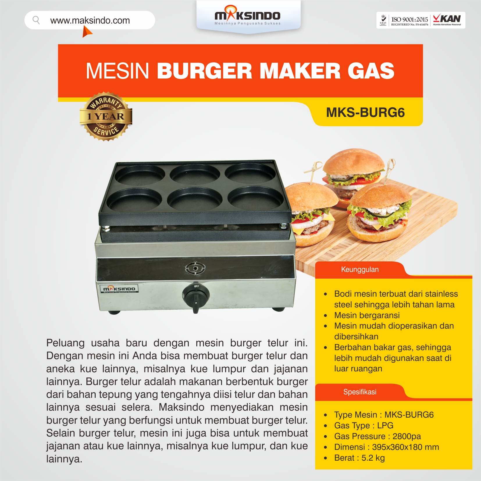 Mau membuat burger dengan cepat dan mudah? sedang menjalankan usaha jajanan kekinian burger telur? Saat ini di Toko Maksindo sudah ada Mesin Burger Gas MKS-BURG6. Kegunaan mesin ini yaitu untuk membuat burger telur dan juga bisa untuk membuat jajanan kue seperti kue lumpur maupun jajanan kue lainnya. Mesin ini pembersihannya sangat gampang, memiliki mutu yang sangat handal, dan higienis. Dengan mesin ini bisa lebih mudah dan ringan dalam membuat jajanan kue tersebut, jadi dapat menjadikan peluang ataupun menjadikan usaha Anda semakin berkembang.