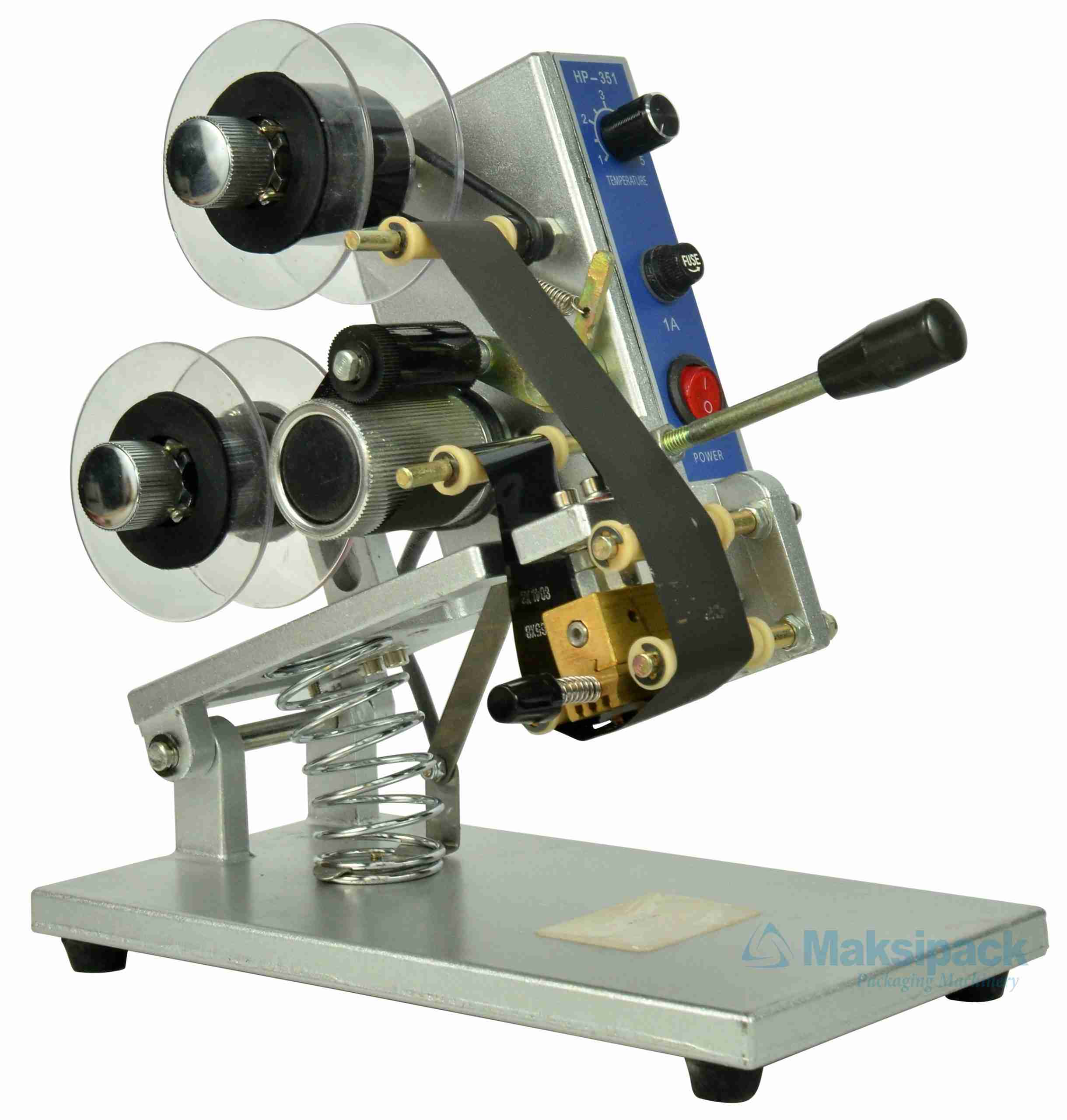Maksindo menyediakan alat pengemas handal dalam sajian mesin hand printer. Mesin hand printer ini berguna untuk menghasilkan angka untuk kemasan dengan memakai pita warna. Pita berwarna dapat difungsikan sebagai pengganti tinta pada mesin pencetak berputar. alat ini dapat digunakan untuk membuat bahan apapun (dengan sifatnya lunak) dengan hasil pencetakan yang tepat serta mudah kering serta tidak lengket, tepat dalam mengganti-ganti huruf. Untuk tipe HP 351 adalah mesin manual, sangat biasa dan mudah dipakai.