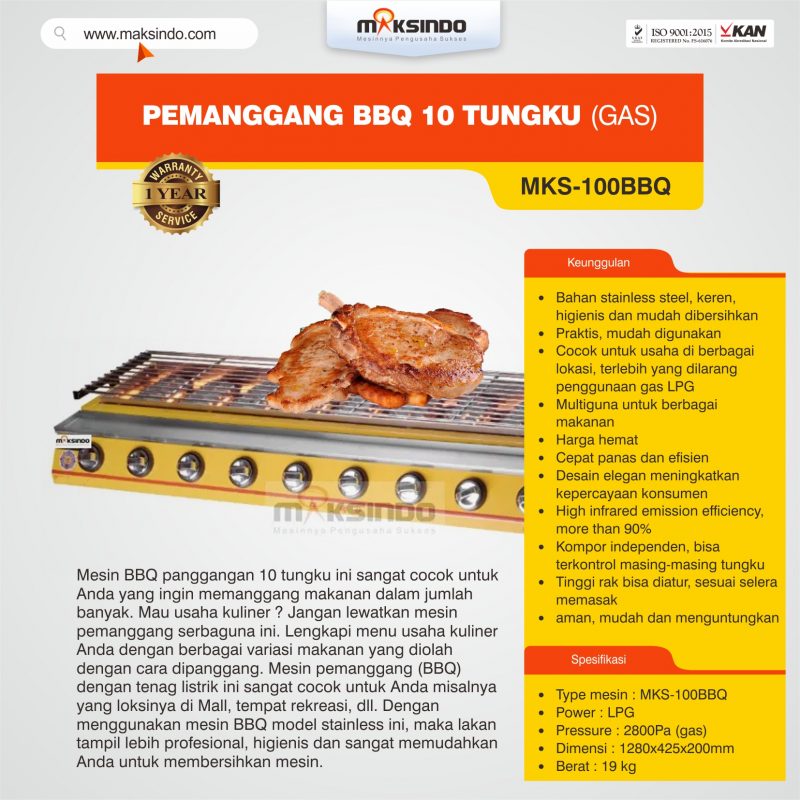 Hendak usaha kuliner dengan menu beragam makanan yang memerlukan pemanggangan? Kini di Maksindo telah ada Mesin Pemanggang BBQ 10 Tungku (Gas) model terbaru dengan guna untuk memanggang beraneka macam makanan kulineran Anda dalam jumlah banyak, jadi dapat memaksimalkan income bisnis Anda. Mesin ini terbuat dari stainless jadi pembersihannya sangat gampang dan juga akan terlihat lebih higienis. Mesin ini sangat cocok untuk yang memiliki bisnis di restoran, hotel, ataupun usaha kulineran yang lainnya karena mesin ini mempunyai mutu yang sangat bagus dan dijamin awet.
