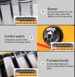 Aplikasi Mesin untuk memanggang aneka makanan : memanggang sate, ikan, daging, jagung, sosis, ayam, dan apapun makanan yang Anda ingin panggang atau bakar
