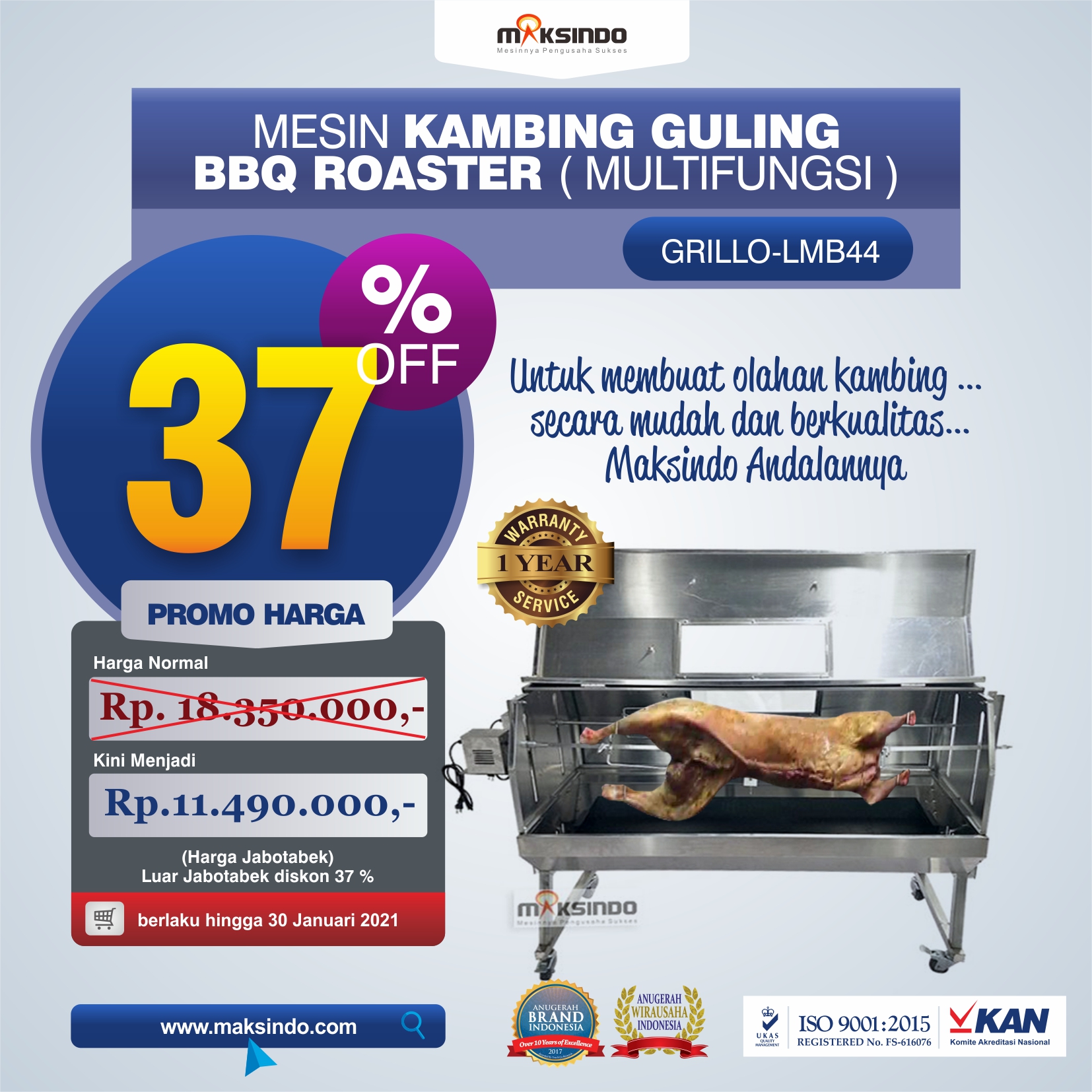 - Asesoris lengkap, artinya mesin dapat digunakan untuk memanggang selain daging lambing guling seperti ikan, daging ayam, daging sapi, sea food dll.