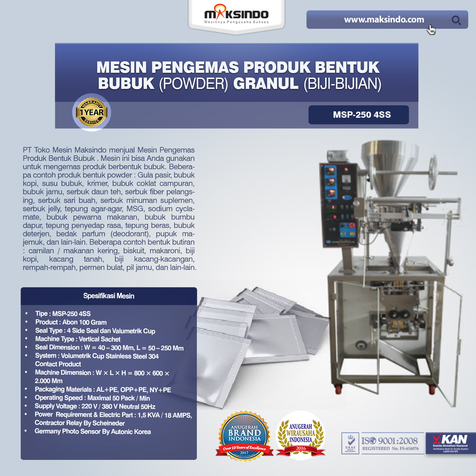 PT Toko Mesin Maksindo menjual Mesin Pengemas Produk Bentuk Bubuk . Mesin ini bisa Anda gunakan untuk mengemas produk berbentuk bubuk. Beberapa contoh produk bentuk powder : Gula pasir, bubuk kopi, susu bubuk, krimer, bubuk coklat campuran, bubuk jamu, serbuk daun teh, serbuk fiber pelangsing, serbuk sari buah, serbuk minuman suplemen, serbuk jelly, tepung agar-agar, MSG, sodium cyclamate, bubuk pewarna makanan, bubuk bumbu dapur, tepung penyedap rasa, tepung beras, bubuk deterjen, bedak parfum (deodorant), pupuk majemuk, dan lain-lain.
