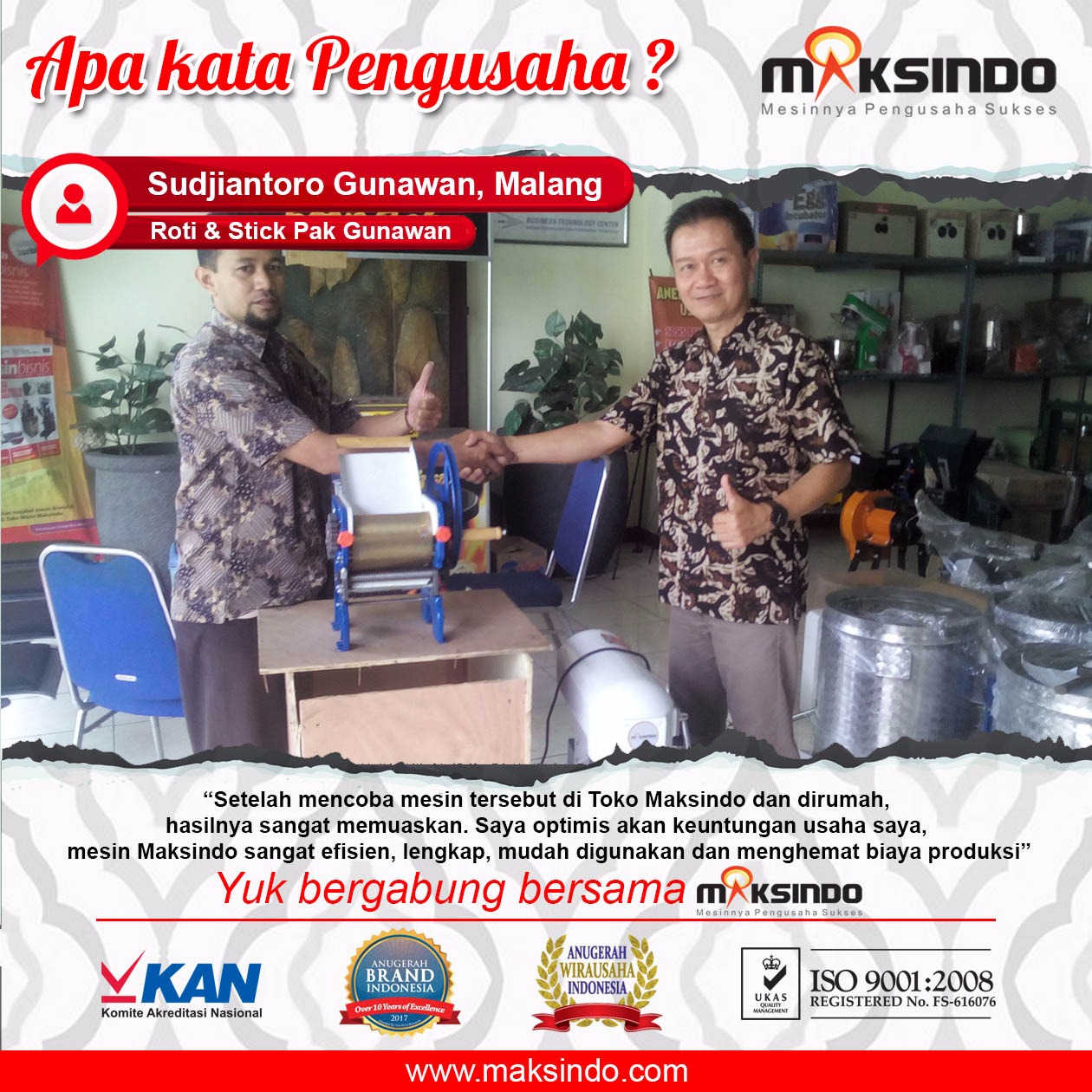 Mesin Cetak Mie dari Maksindo terjamin kualitas dan mampu membantu banyak pengusaha, salah satunya bapak Sudjiantoro Gunawan yang berasal dari Malang ini. Menjalankan usaha dengan nama “Roti & Stick Pak Gunawan”